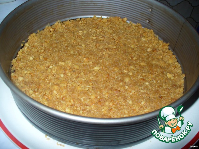 Сливочное масло растопить и смешать его с крошками печенья. Очень хорошо перемешать. Бортик разъемной формы установить на блюдо и выложить смесь печенья с маслом. Равномерно распределить, утрамбовать и поставить конструкцию в холодильник.