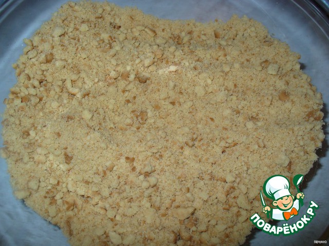 Печенье нужно измельчить в крошку. Это можно сделать в блендере или измельчителе. Или положить в полиэтиленовый пакет и измельчить при помощи скалки.