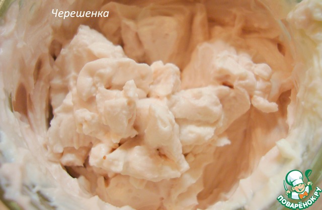 Добавляем маскарпоне и сначала аккуратно перемешиваем вилкой, а уже затем, когда масса станет однородной можно взбить на маленьких оборотах миксера… Продолжая взбивать, добавить сироп или ликер (на ваше усмотрение, я люблю Бейлис добавлять)…