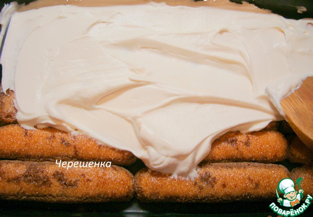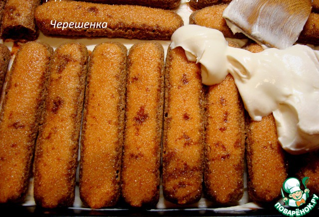 Окунаем каждую палочку Савоярди в остывшее какао. Сразу хочу сказать, что действуйте без фанатизма! Не нужно Савоярди долго держать в какао, чтобы в дальнейшем не получить излишнюю влажность в десерте!!! Т. е. нужно быстро окунуть (на счет раз_и), перевернуть (раз_и), вытащить, уложить и т. д. Что-то мне это напомнило порядок употребления текилы: натираем, насыпаем, слизываем, выпиваем, закусываем;))) Итак, укладываем первый слой…