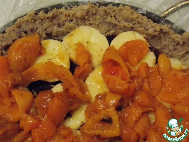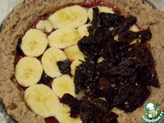 Бананы режем колесиками. Курагу и чернослив полосками. На джем кладем половину бананов, с вверху кладем слой чернослива.