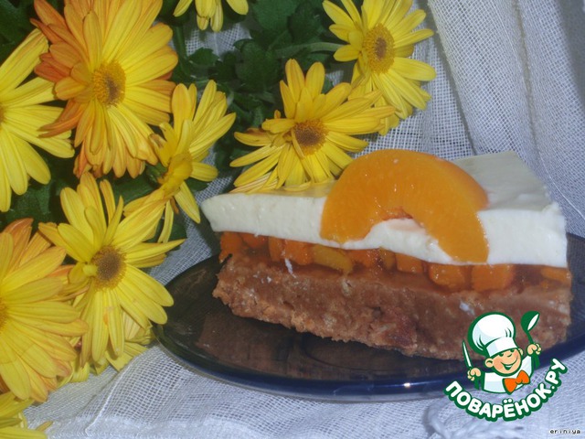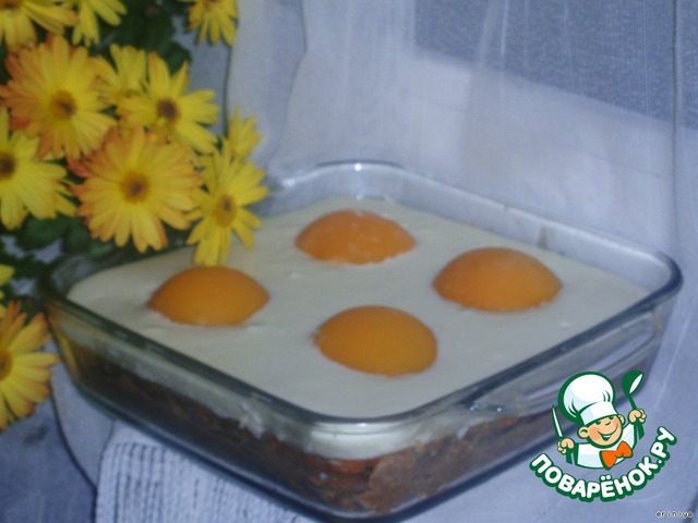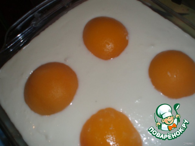 Как только начнет загустевать, выливаем на торт и сверху выкладываем половинки персиков.