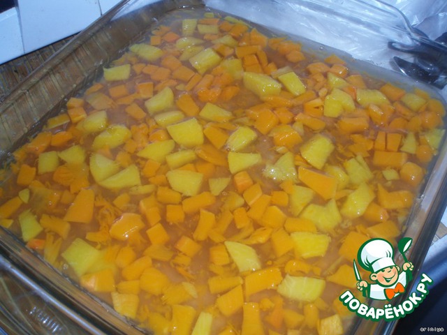 Из компота откладываем половинки персиков 4 штучки. Остальные персики режем, заливаем раствором желатина. Персиков у меня было мало, поэтому я взяла еще и тыкву, приготовленную в свч.