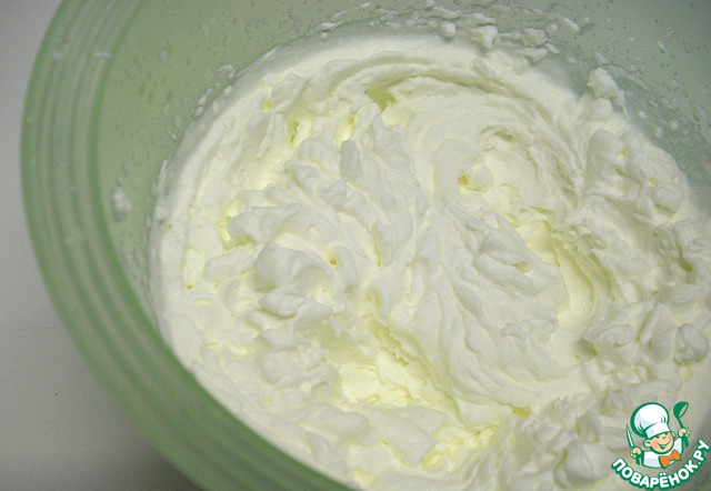 Холодные сливки взбить с сахарной пудрой до крепких пиков, но не переусердствуйте, иначе сливки могут превратиться в масло.