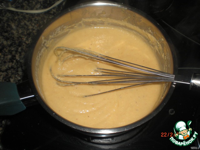 Миндаль с молоком измельчаем блендером, добавляем желтки, оставшуюся сгущёнку и, всё время помешивая, варим до кремового состояния, снимаем с огня, добавляем набухшие пластинки желатина без воды (или растворённый, но не доводить до кипения), обычный желатин.