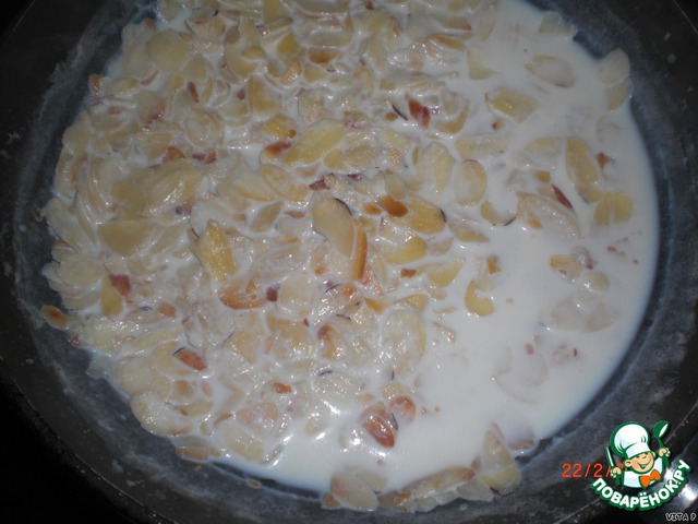Миндаль измельчённый пластинками обжариваем на сковороде, добавляем молоко, даём закипеть. Снимаем с огня и накрываем крышкой.