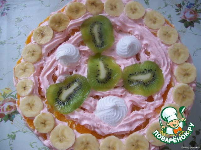 | На сайте уже есть несколько подобных рецептов, а это мой вариант тортика. Мой любимый сказал, что никогда не пил чай с апельсинами и бананами, но ему очень понравилось! Нежный сливочно-фруктовый вкус будет прекрасным дополнением к чаю на праздничном столе. И к тому же, его не надо печь и готовится очень быстро! Уверена, что вам мой тортик тоже понравится!!! |