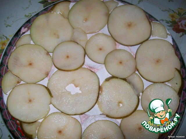 Дальше выкладываем нарезанную тонкими кружочками спелую мягкую грушу (я брала конференцию).