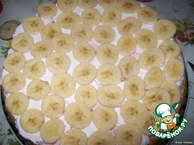 Дальше повторяем - корж, сливки… Закрываем это бананом.