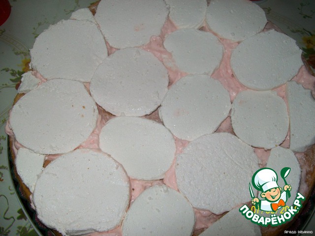 Следом выкладываем разрезанный на 3 части зефир. Резать его нужно горячим ножом, чтобы зефир не прилипал и хорошо резался. Я обмакивала нож в кипяток и тут же вытирала его сухим полотенцем.