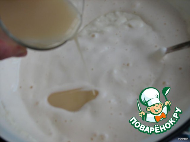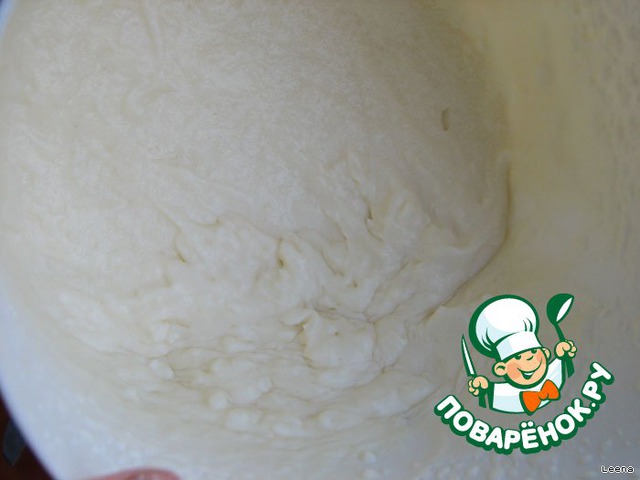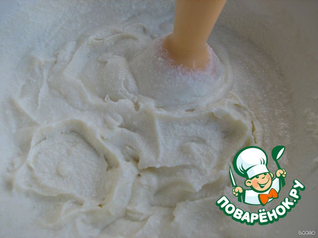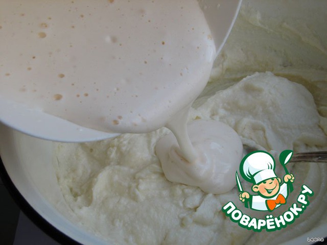 Взбиваем также 2 охлажденных яйца с ложечкой сахара в пышную пену и медленно помешивая вливаем в сливочно-творожную массу. Получается очень нежная воздушная консистенция.