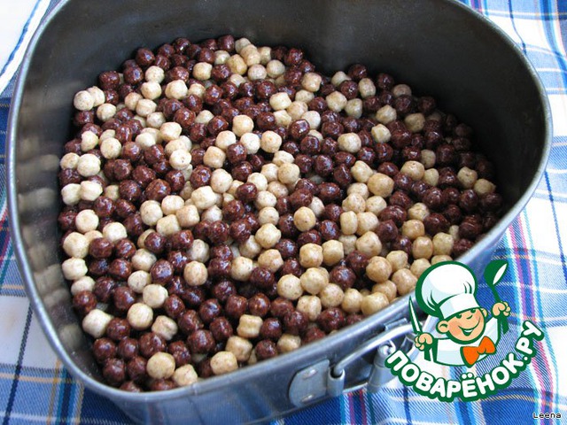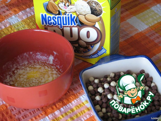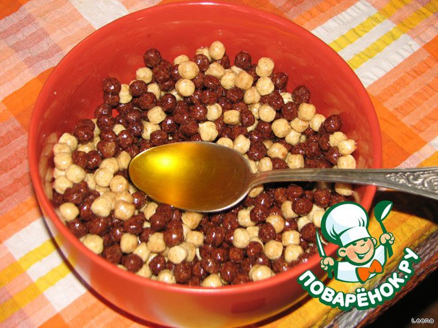 Для начала, на водяной бане растопим сливочное масло. Два-три стакана сухого завтрака "Несквик" облить маслом.