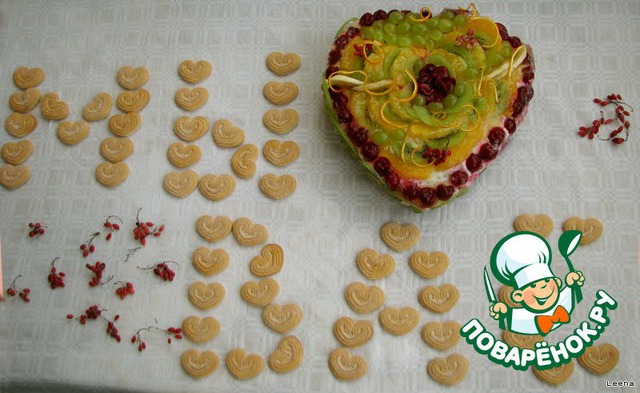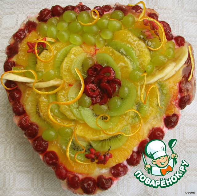 Покрываем последним слоем творожной массы и украшаем ягодами и фруктами по желанию. Я использовала киви, виноград, вишни, бананчик, очищенный от альбедо апельсин и немного барбариса. Фрукты можно покрыть желатином, чтобы они не обветрились и не потеряли цвет.
