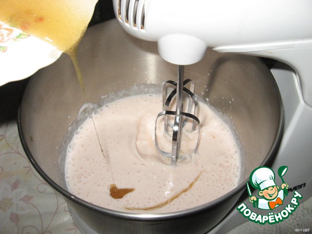 Йогурт слегка взбиваем на самой низкой скорости, затем вливаем желатин, тщательно перемешиваем.