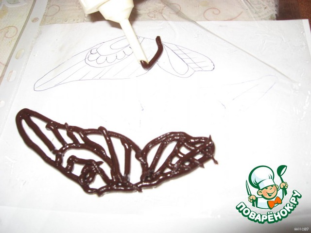 Рисуем на листе бумаги крылья бабочки, сверху кладем файл и рисуем шоколадом по рисунку. Затем я положила файл на разделочную доску и убрала в морозилку.