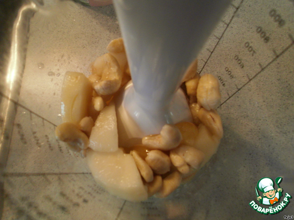 Грушу очистить, нарезать (у меня получилось 220 г). С кешью слить воду и измельчить их в блендере с грушей и 1 ст.л. меда (я добавляла 1 ч.л, чтобы было не очень сладко).