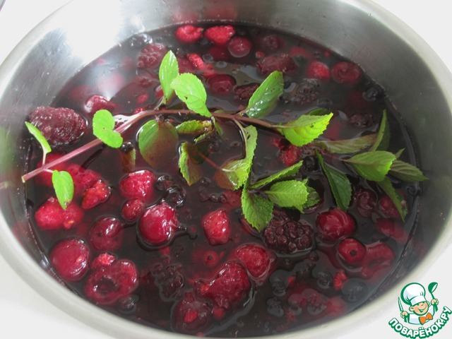 1 литр воды довести до кипения, добавить сахар (300 гр), ягоды (600 гр) и 2 веточки мяты. Варить 15 минут, затем извлечь мяту и остудить.