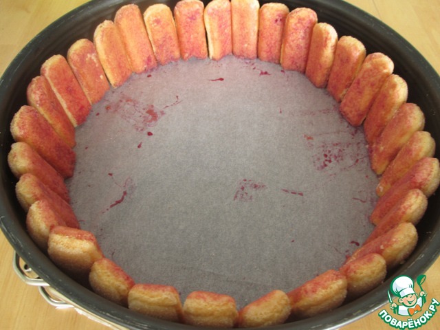 Дно разъемной формы (диаметр 26 см) застелить пергаментом. У меня печенье длинное, его я разрезала по полам. Если у Вас - короткое, просто отрежте не много с одной стороны, чтобы оно хорошо становилось в форму. Каждое печенье обмакнуть с одной стороны (без сахара) в сироп и поставить у бортика формы.