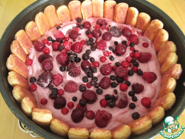 И снова добавить 1/2 сливочной смеси. Форму закрыть пищевой пленкой и поставить минимум на 6 часов в холодильник. Перед подачей торт можно украсить дополнительно ягодами.