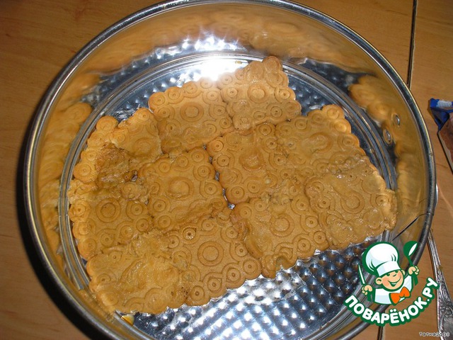 На форму выкладываем размоченное в кофе или чае печенье в 2 слоя или кому как нравится