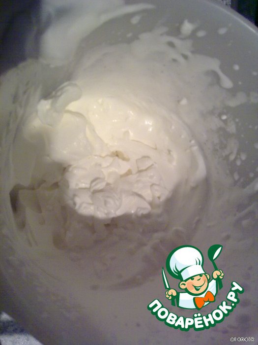 Взбить сливки до крепких пиков. В охлажденный крем аккуратно ввести сливки и натертый на терке шоколад. Перемешать