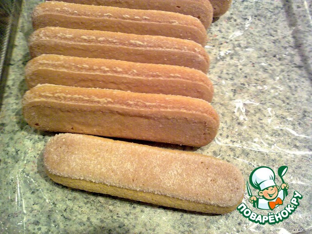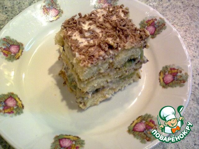 Бисквитное печенье сложить в один ряд в форму близко друг к другу. Смазать печенье кремом. Выложить нарезанные кружочками киви. Дальше снова печенье, крем и киви. Последний слой печенья. В конце заливаем слоем крема.