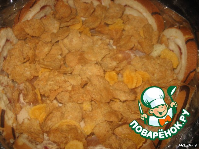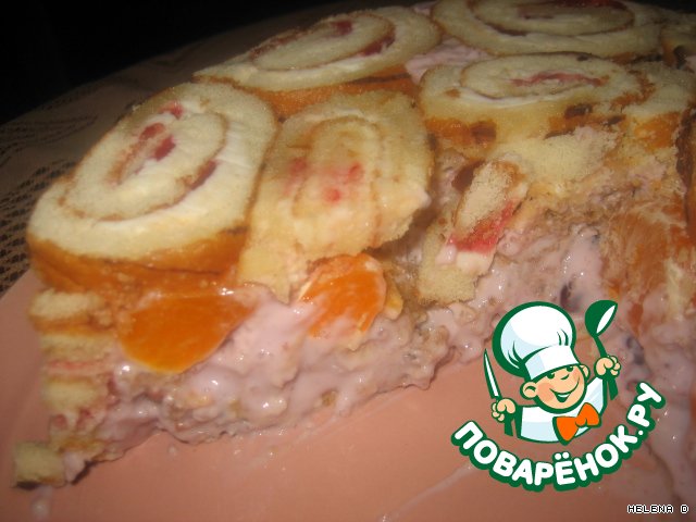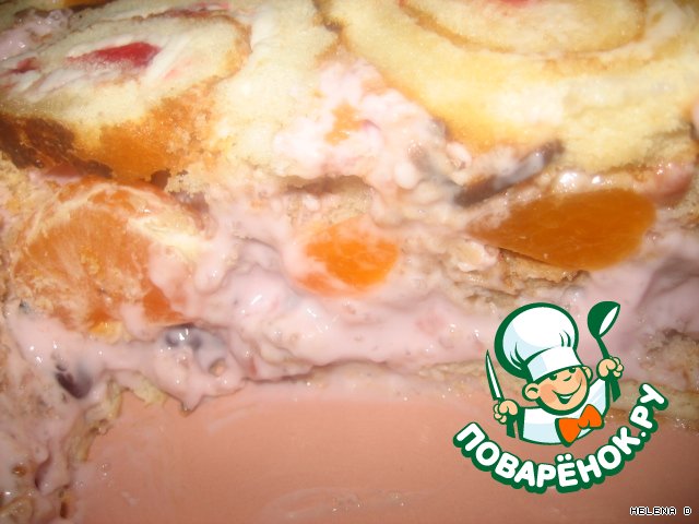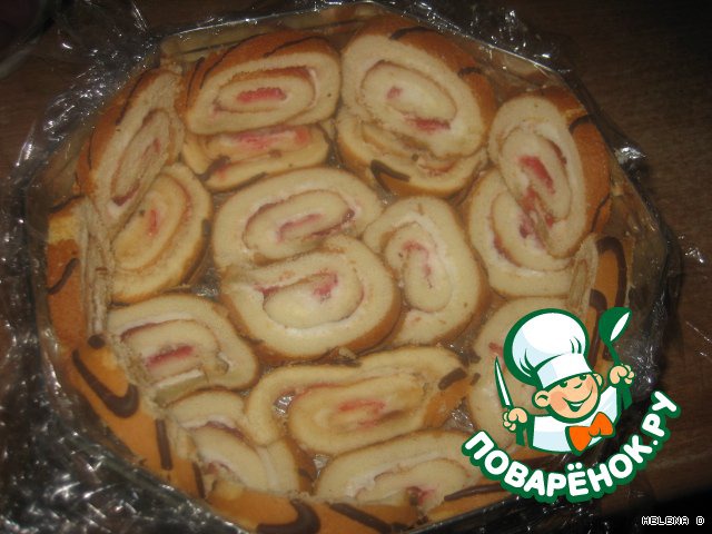 выстилаем любую красивую форму пищ.плёнкой и выкладываем полностью рулетом