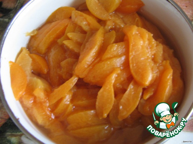 Туда же добавляем абрикосы. (Я-то сначала выложила абрикосы по коржу, но зря: они все равно все сползли, когда я стала выкладывать начинку).