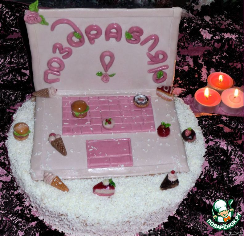 Собрала торт, установила на него ноутбук и украсила фигурками из мастики.