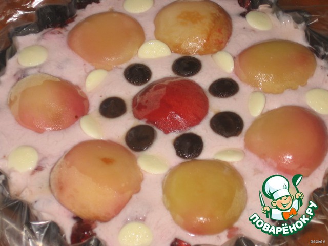 Сверху выложила персики, украсила шоколадными монетками и отправила в холодильник на 2 часа.
