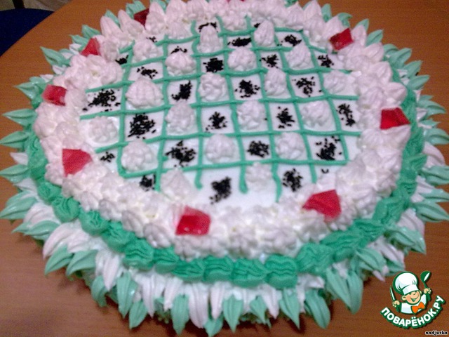 Когда готовы слои,покрыть весь торт готовым кремом из пакетика или взбитыми сливками с сахором.Украсить по желанию и оставить на холоде на 5-6часов.Торт будет сочным,можно положить и 2 слоя бисквита.Вобщем делать легко и кол.-во продуктов можно использовать на усмотрение.Торт я делала дочке на день рождение.И вот как получилось