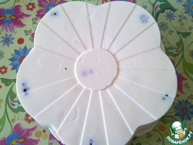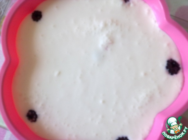 Отделить от основы для торта 1/4 часть в отдельную посуду и добавить в неё какао. Перемешать. Для заливки торта, нам понадобится силиконовая форма. В форму залить белую массу выложить ягоды ежевики и поставить в морозилку на 10 минут. За это время нижний слой успеет застыть. Поверх первого слоя, заливаем второй слой творожной массы с какао. Отправляем торт в холодильник до полного застывания.