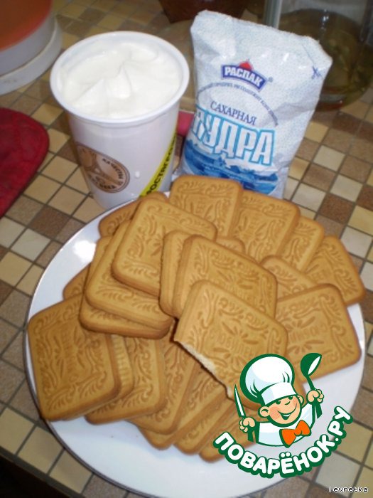 В посуду, желательно квадратную, выкладываем первый слой печенья и смазываем сметаной