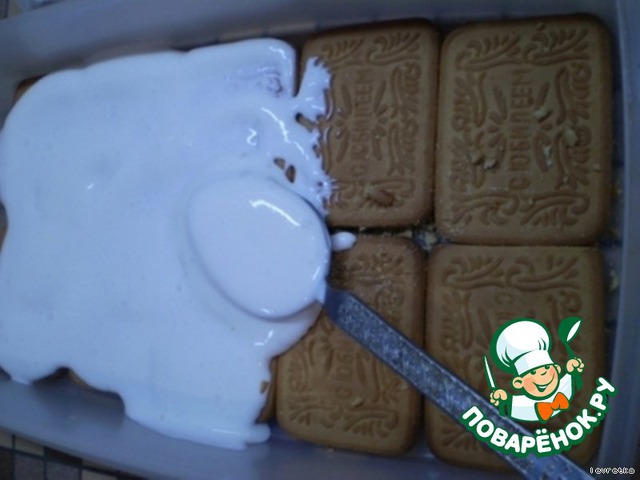 Далее кладем второй слой печенья, так чтобы печенюшки совместились, и опять слой сметаны