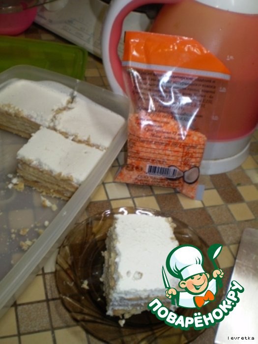 Утром достаем из холодильника, разрезаем на пирожные и украшаем. Допустим, кокосовой стружкой.