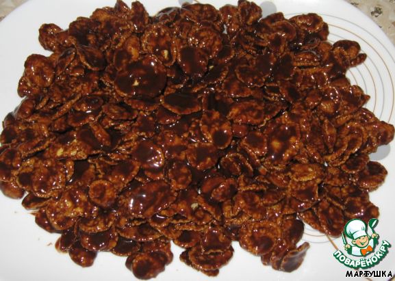 | Торт без выпечки. Не сложен в изготовлении. Мне понравилось есть в первый день - кукурузные хлопья "похрустывали" во рту :-). На следующий день хлопья пропитались, и веселого похрустывания как не бывало!!! |