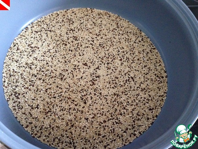 Сначала хорошенько промоем киноа. Я замочила его минут на 20 холодной водой, воду пару-тройку раз меняла. Затем, тщательно промыла под проточной холодной водой.