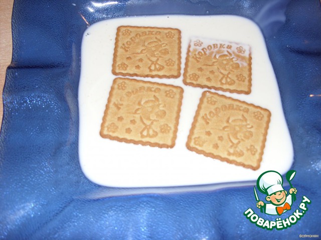 Печенье, буквально на секунду, обмакиваем в молоко и выкладываем в форму для нашего тортика.