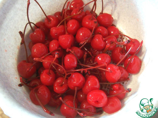 Смешать белки и заварной крем, лучше при помощи миксера. Коктейльную вишню откинуть на дуршлаг, чтобы стек сироп.