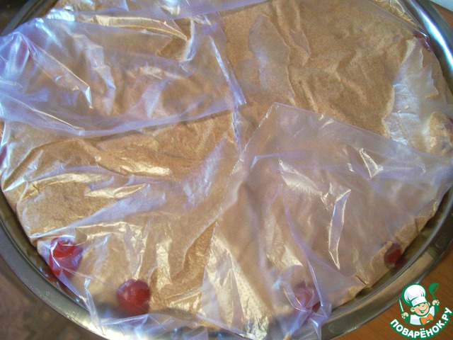 Начинаем собирать торт. Из указанного количества ингредиентов у меня получилось 2 достаточно больших тортика. Дно посуды, в которой вы будете собирать торт, выстелить пищевой пленкой. У меня пленка закончилась, и я использовала разрезанный целлофановый пакет. На дно выложить вишню. Вот так я делала для одного тортика.