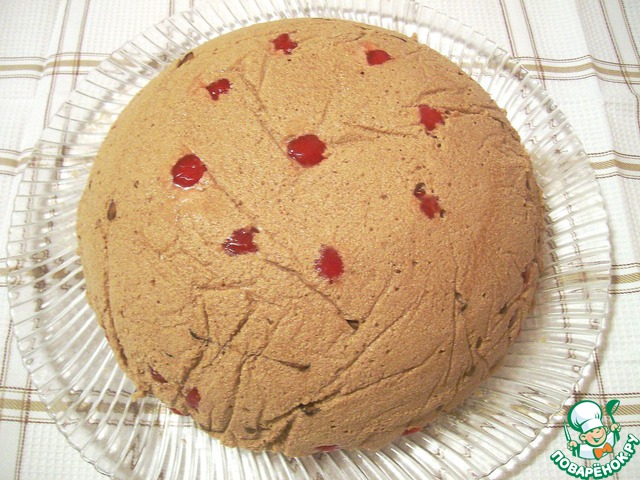 После пропитки аккуратно разворачиваем пленку, переворачиваем торт на блюдо. Я сверху накрывала торт блюдом, и только потом всю эту конструкцию переворачивала. Снимаем пленку сверху. Получаем такой суфлейный тортик. Этот мы ели сразу.