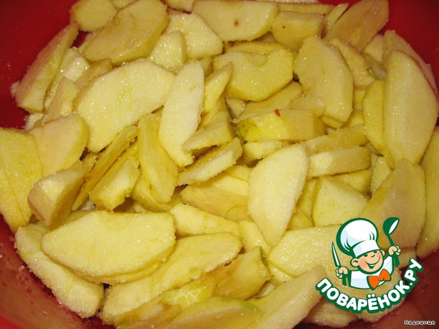 Яблоки очищаем от кожицы, режем на четыре части, а потом на тонкие ломтики. Сбрызгиваем лимонным соком и засыпаем сахаром. Ставим на 10 минут в холод.