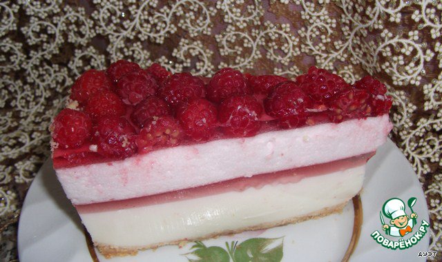 На застывший десерт плотно укладываем малину и заливаем приготовленным малиновым желе из 1-й пачки.