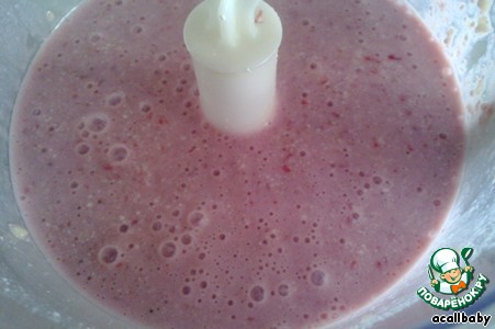 Тем временем творог+молоко+банан+ клубника+сахар взбить вместе в блендере (или миксером).