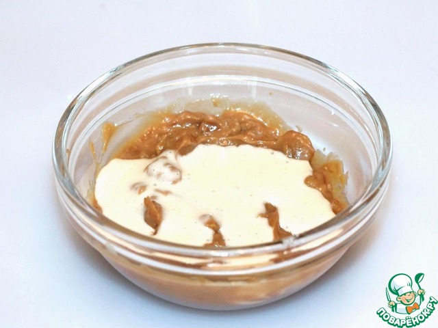 Готовим крем для смазки печенья: если у вас густая варенка, добавьте 2 ст. л. сливочной смеси и хорошо перемешайте.