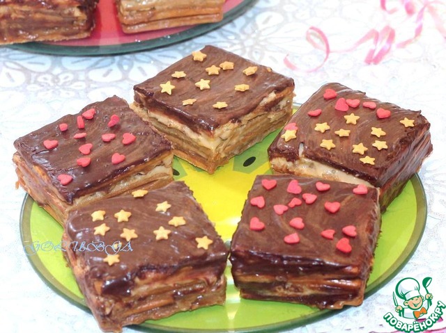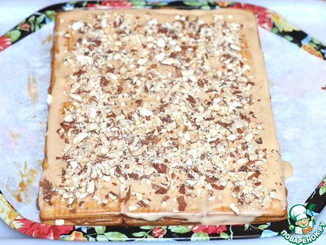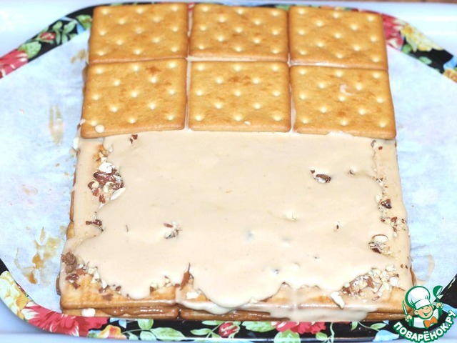 Сверху накройте вторым слоем печенья и смажьте сгущенкой и так 3 ряда печенья. Не старайтесь вдавливать печенье, аккуратно и легко выкладываете ряды.