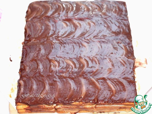 В остатки сливочного крема (1/3 ч.), добавляем 2-3 ч. л. какао, 1 ст. л. сливочного масла, смешиваем, если мало сахара, добавьте по вкусу. Разогреваем крем на водяной бане и поливаем печенье сверху. Ставим тортик в холодильник.