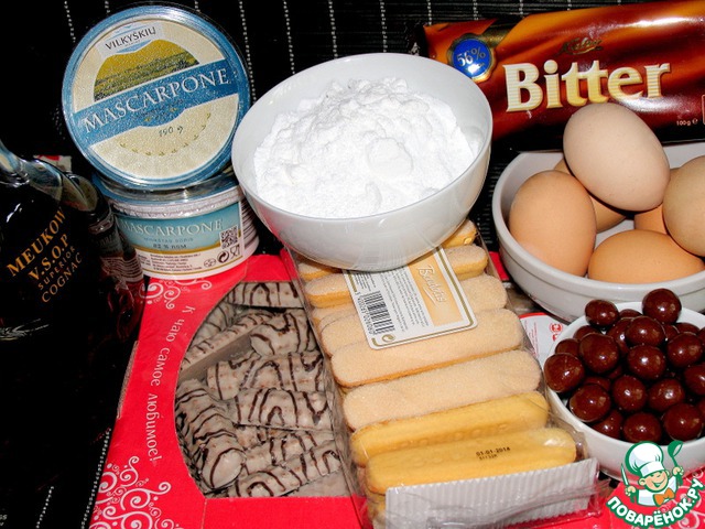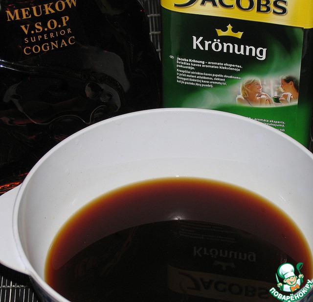 Крепкий кофе "Jacobs" с коньяком "Meukow" для пропитки печенья савоярди.