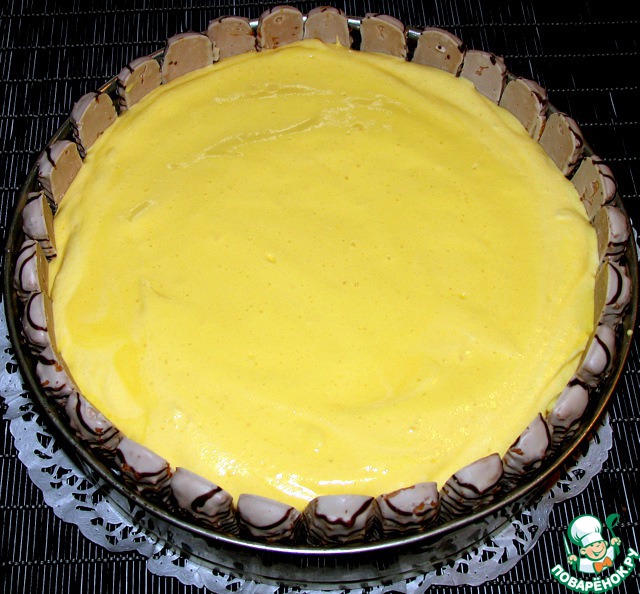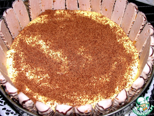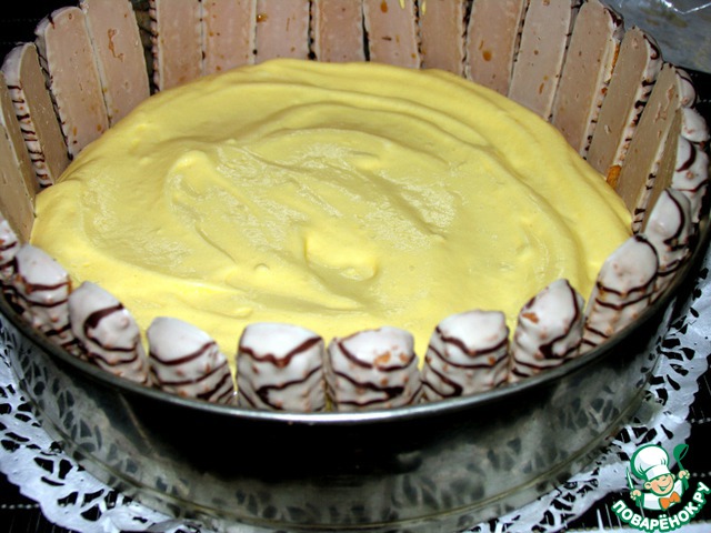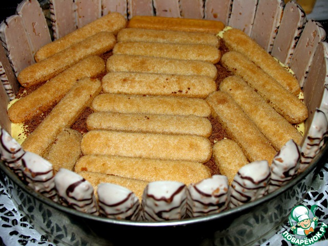 Разъёмную форму застелить бумагой и вертикально выложить по краям печенье с глазурью. А на дно формы ряд савоярди смоченное в кофе с коньяком. На печенье выложить крем.