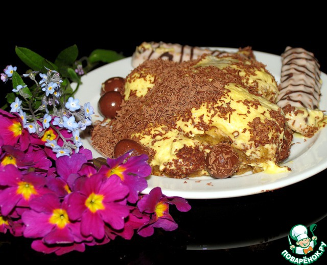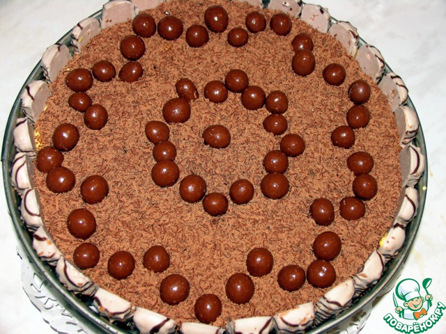 По верху крема посыпать тёртым шоколадом и украсить орехами в шоколаде. Убрать в холодильник на несколько часов...